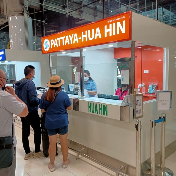 공항에 내리셔서 1층으로 내려가 8번 게이트 쪽으로 가시면 파타야, 후아힌 등 주요 도시행 버스 카운터가 줄지어 서 있습니다.